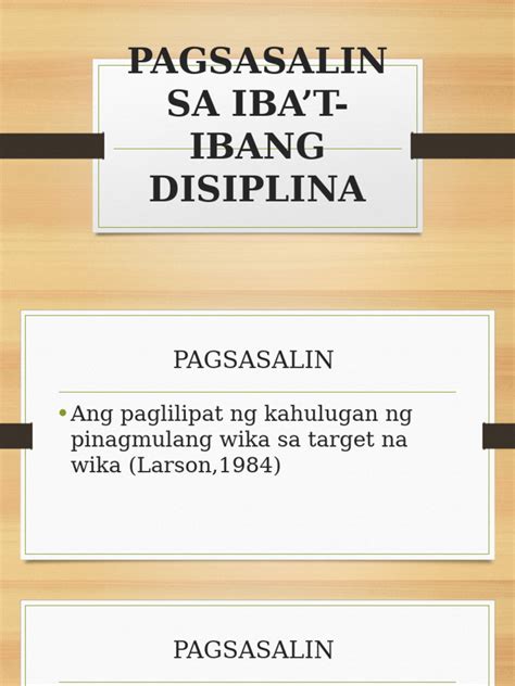 Ang pagsasalin sa sariling disiplina ay isang proseso kung saan ang mga konsepto, ideya, at kaalaman mula sa isang wika ay inililipat at inaangkop sa ibang wika. Ito ay isang mahalagang gawain na naglalayong maipahayag nang wasto ang mga impormasyon at mensahe sa pamamagitan ng paggamit ng ibang wika.